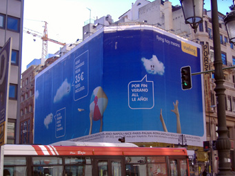 Se trata de un edificio en obras, cubierto por una gran lona publicitaria de la compañía de bajo coste Vueling. Nada fuera de lo común hoy en día, si no fuese porque al acercarnos al cartelón, podemos ver esto: