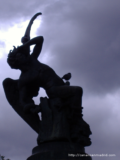 La escultura corona una fuente situada en uno de los cruces que forman dos de las amplias avenidas del parque del Retiro, imponente en medio de cientos de paseantes, ciclistas o patinadores. Porque a fuerza de permanecer en el sitio, ya ni los pájaros le tienen respeto.