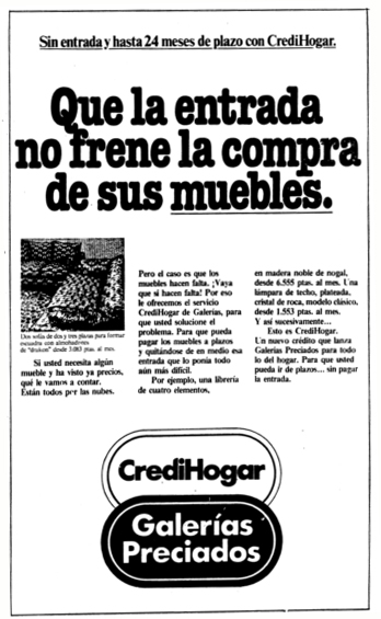 Esta revolucionaria oferta, lanzada en un escenario de crisis económica y aumento del paro -¿a qué me recuerda esto?- consistía en ofrecer a sus clientes la posibilidad de financiar sus compras superiores a 25.000 pesetas hasta en 24 meses y sin pagar entrada, gracias a su CrediHogar.