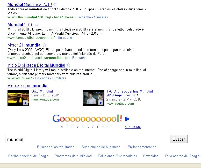 Sin embargo, el detalle más curioso de esta búsqueda se encuentra al final de la pantalla, donde el habitual logo en el que la primera «o» de Google se multiplica para permitir el acceso directo a diferentes páginas de resultados ha sido sustituido por la muy apropiada palabra «Goooooooooool!».