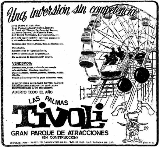 El parque de atracciones Tívoli fue uno de tantos proyectos que, a mediados de los años 70 del pasado siglo, pretendían convertir Las Palmas de Gran Canaria en una gran ciudad de su tiempo, preparándola para encarar la, por aquel entonces, aún lejana llegada del nuevo siglo. Sin embargo, como la mayor parte de esos ambiciosos proyectos, jamás llegó a hacerse realidad.